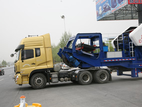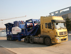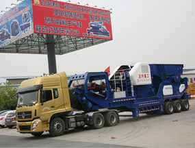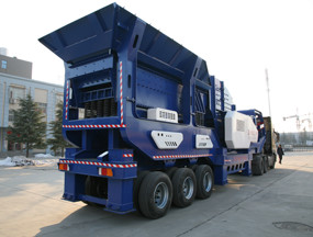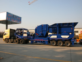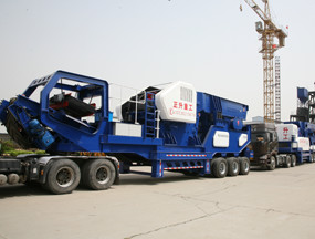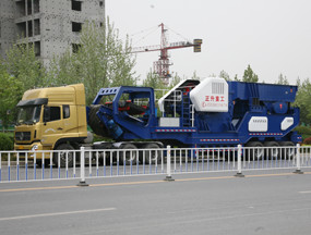 铲车通过上料平台,将石灰石原石送入料仓内,紧接着料仓是移动破碎站的振动给料机,物料通过振动给料机均匀的喂入欧版鄂式破碎机内,及保证了原料的源源不断,也避免了破碎设备因受到物料的冲击而造成不必要的损坏,破碎后的物料经过带有除铁器的皮带机,在出铁之后被送进中转料仓。